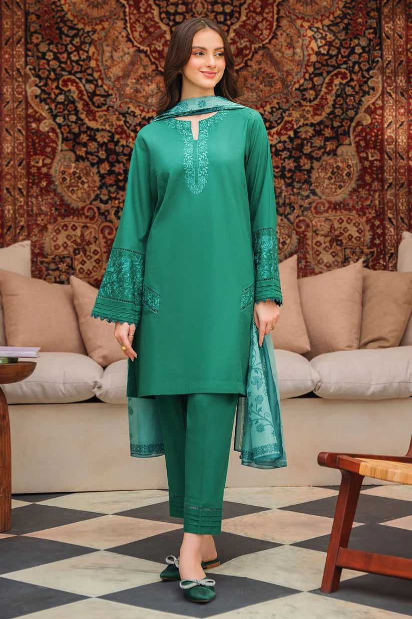 BrandsInn-3PC DHANAK EMBROIDERED SHIRT WITH COUTRAI PRINTED SHAWL AND TROUSER-BI-4150
